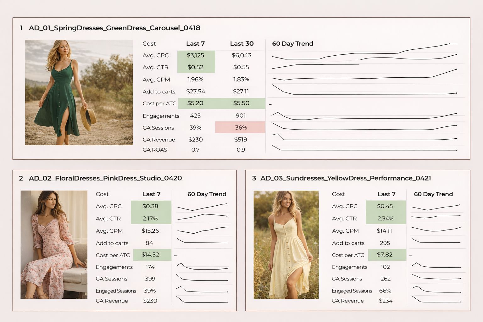 “Our v neck sweater content is driving the highest CTRs right now. Based on what we’ve seen work, we need more studio BTS content - single outfit, mix of mid-length and close-up shots so the product details can be showcased”